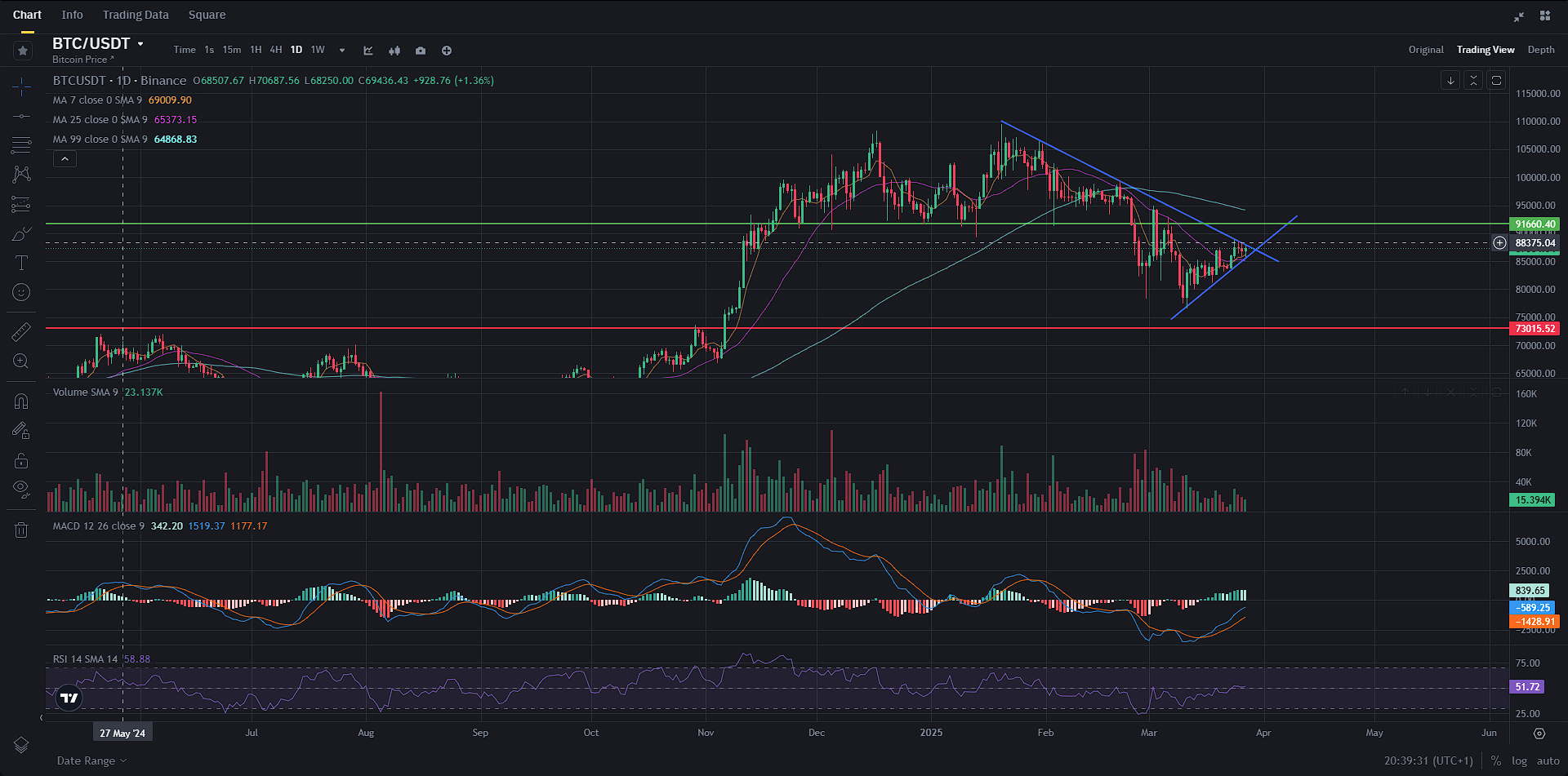 Ciekawa sytuacja na BTC/USDT. Rozgrywany klasyczny trójkąt z możliwym wybiciem górą przy potencjalnym zatrzymaniu się na dawnej linii wsparcie, która teraz będzie stanowić opór. 15 marca MACD przeciął niebieską linią linie czerwoną poniżej poziomu 0 co oznacza sygnał kupna. RSI 14 na poziomie 51,75 nie pokazuje jednoznacznie ani wykupienie ani wyprzedania rynku. Przy wybiciu trójkąta górą również będziemy mieli wybicie trendu spadkowego. Obecna korelacja z US 100, który może zbliżać się do końca korekty może dodać impetu wzrostom na BTC. W przypadku odwrotnego scenariusza najbliższy poziom to 80k następnie 77-76 gdzie ostatnio była domykana luka cenowa na kontraktach futures.